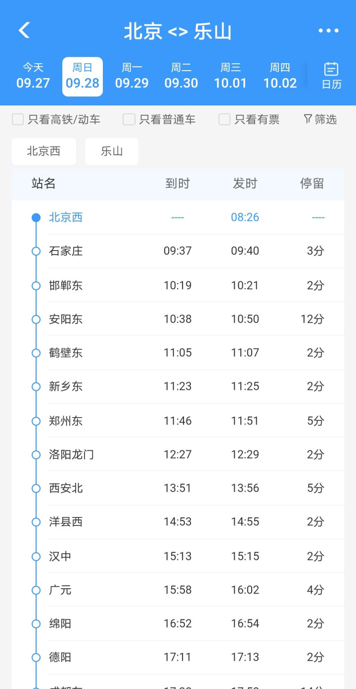 | 从北京西站坐高铁去乐山,全程不到十小时。这趟G1591列车每天早上八点二十六分开,晚上六点四十四分到,中途不停太多站。二等座八百多快凑够一千块钱,商务座快三千了,不过比起飞机能直达小城市,坐车的人还是不少。沿线经过五个省,大部分乘客都是冲着乐山那些景点去的。